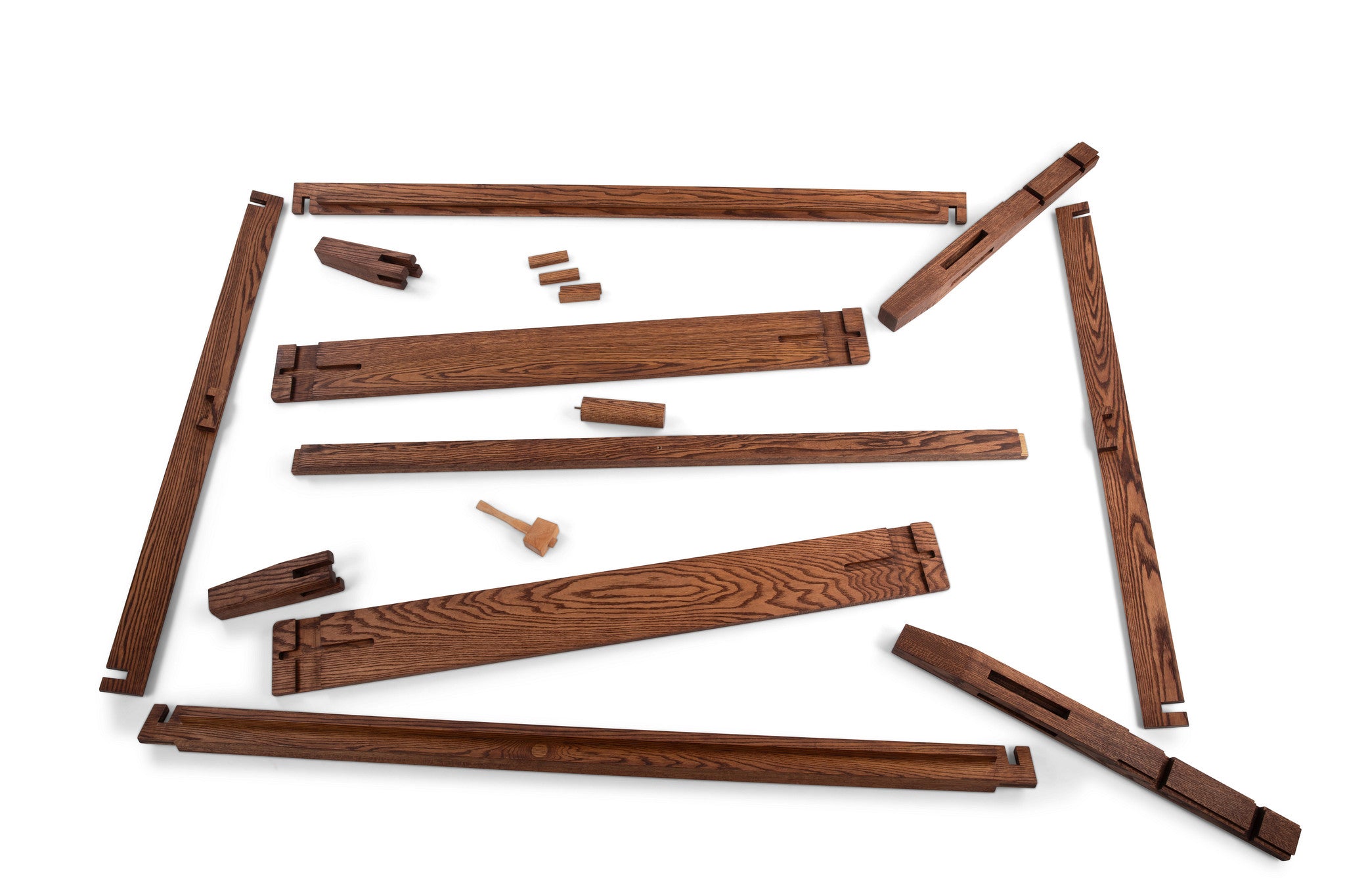 Assembled using traditional Japanese joinery, the Atalaya frame uses keyed sliding dovetails, castle joints, and splined "U" joints to come together in minutes without the use of any hardware.